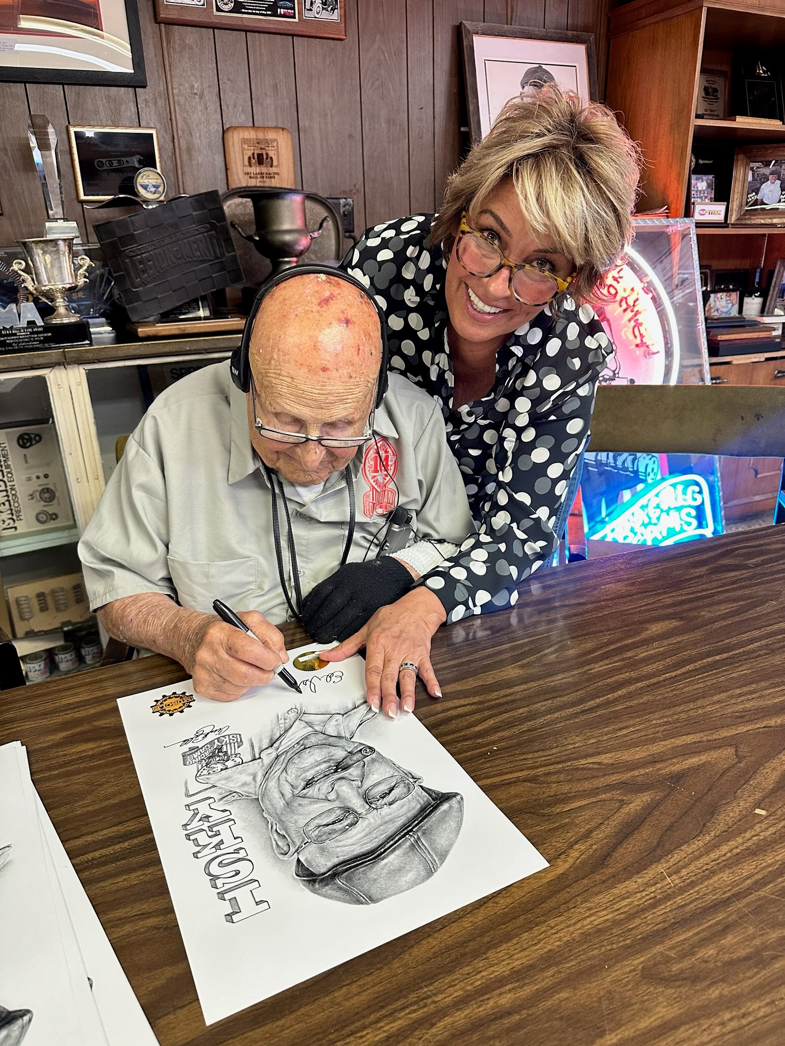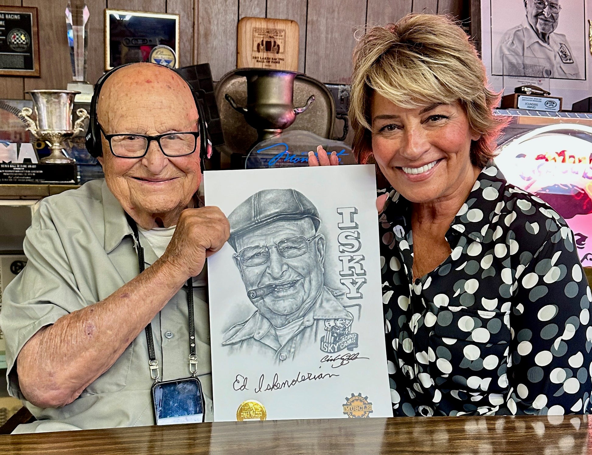 Cindy Gibbs hand-drawn original artwork created to honor and celebrate the 104th birthday and amazing career of Ed Iskenderian. The original artwork will be donated by Desktop Muscle Cars to the museum for all to enjoy. You can own an amazing hand-signed lithograph created from the original artwork, signed and numbered by artist Cindy Gibbs and signed by the legend himself, Ed Iskenderian. Only 104 dual signed lithographs will be available, each crash numbered, 1/104, 2/104, etc... Don't wait as these will go quickly! Order now or wish you did!!